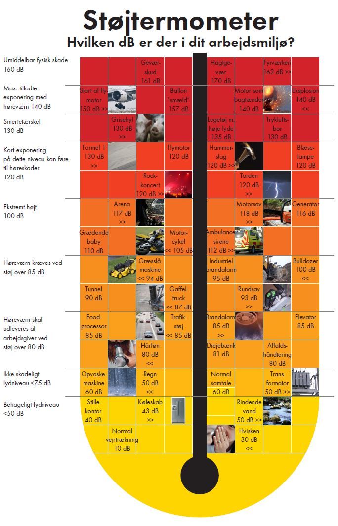 eksempel kan arbejdere indenfor let industri og servicefag samt personale i barer og den offentlige sektor, være udsatte for ikke tilladte støjniveauer og dermed have behov for passende beskyttelse. Overstiger støjniveauet 95 dB, skal en korrekt støjmåling