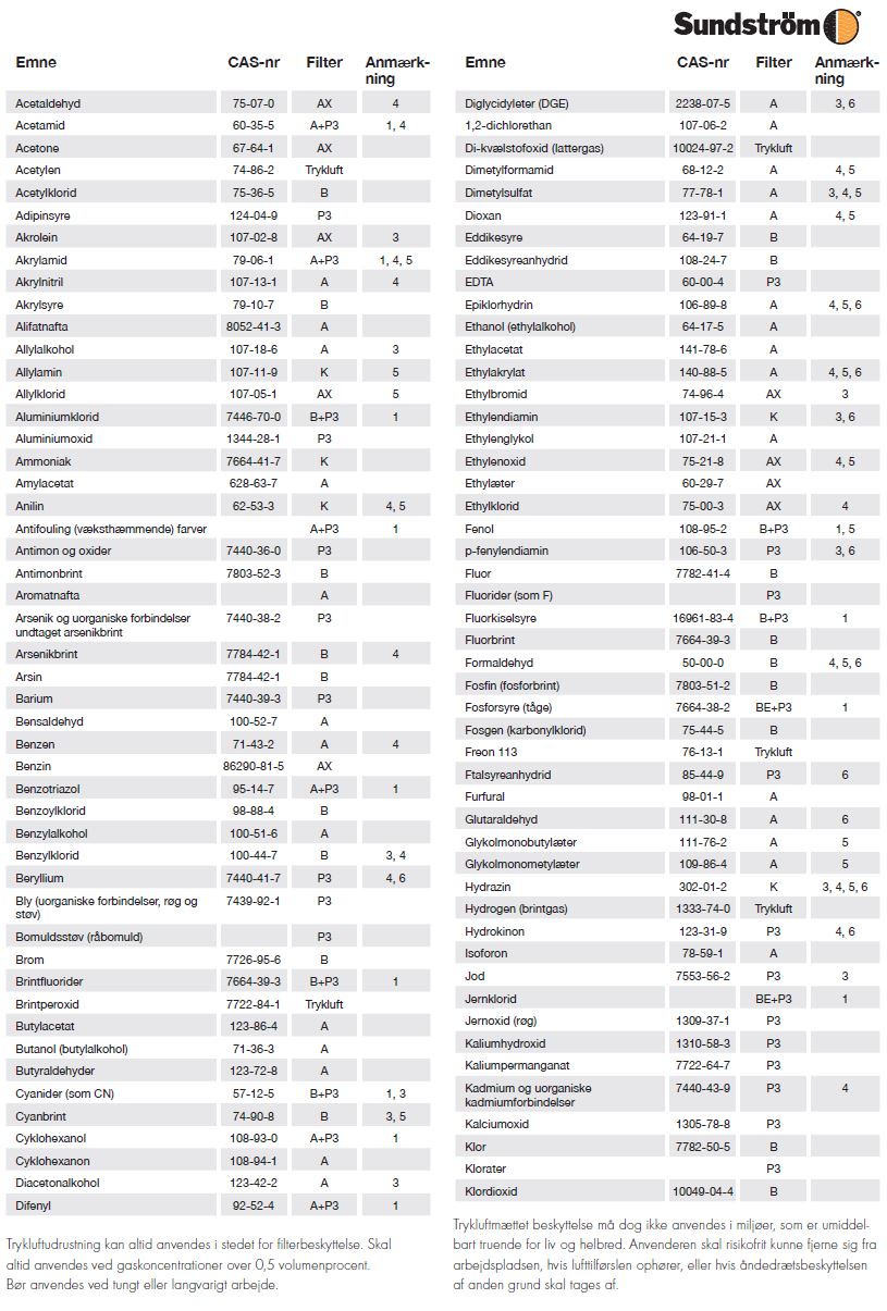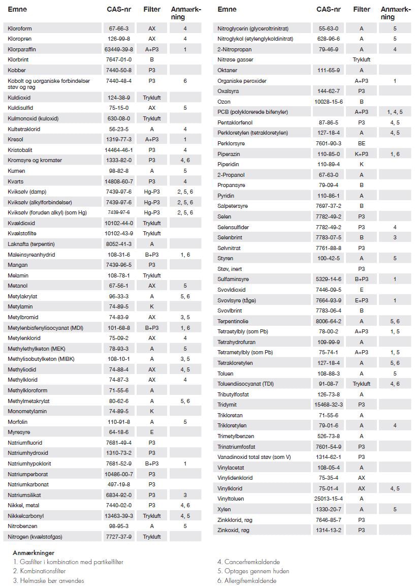 Få her et overblik over hvilke åndedrætsværn, der bør anvendes i forbindelse med forskellige stoffer.
