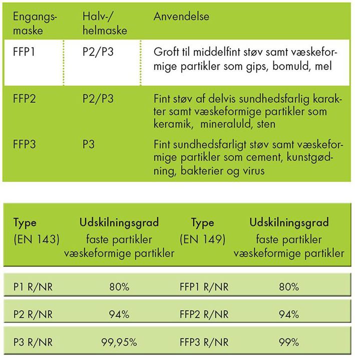 På illustrationen til venstre vises partikelfiltres anvendelsesmulighed inden for engangsmasker såvel som hel- og halvmasker: